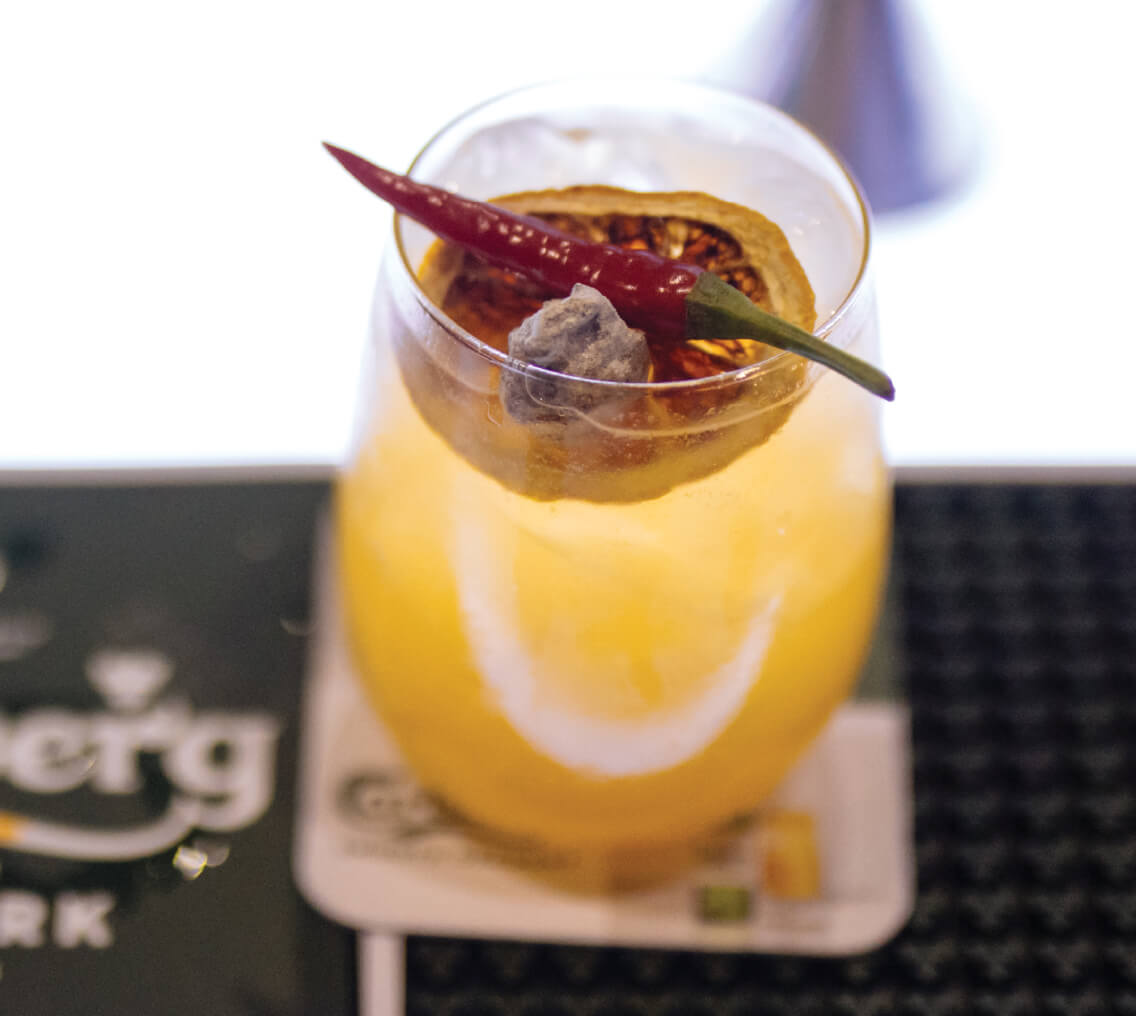 • 20ml Monin Yuzu Puree • 30ml lemon Juice • 10ml sour plum water • 3-5 dash of Tabasco sauce • Garnish with Dried lemon, sour plum and red chili padi