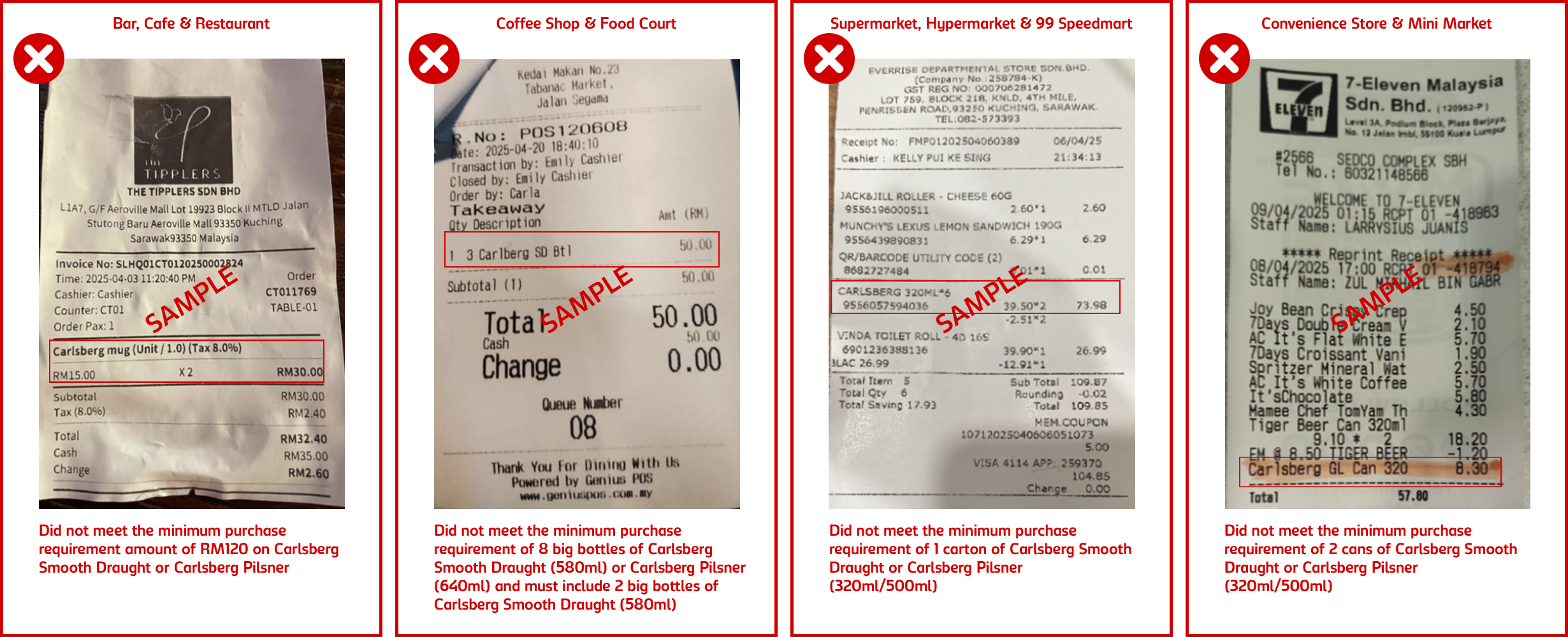 • Bar, Café & Restaurant - Purchase a minimum of Ringgit Malaysia One Hundred Twenty [RM120] of Carlsberg Smooth Draught/Carlsberg Danish Pilsner in a single receipt to get One [1] entry.