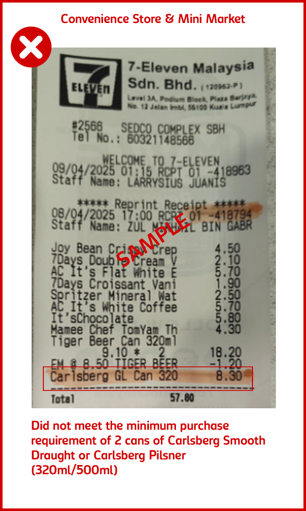• Convenience Store & Mini Market - Purchase Two [2] cans of Carlsberg Smooth Draught/Carlsberg Danish Pilsner (320ml or 500ml) in a single receipt to get One [1] entry.